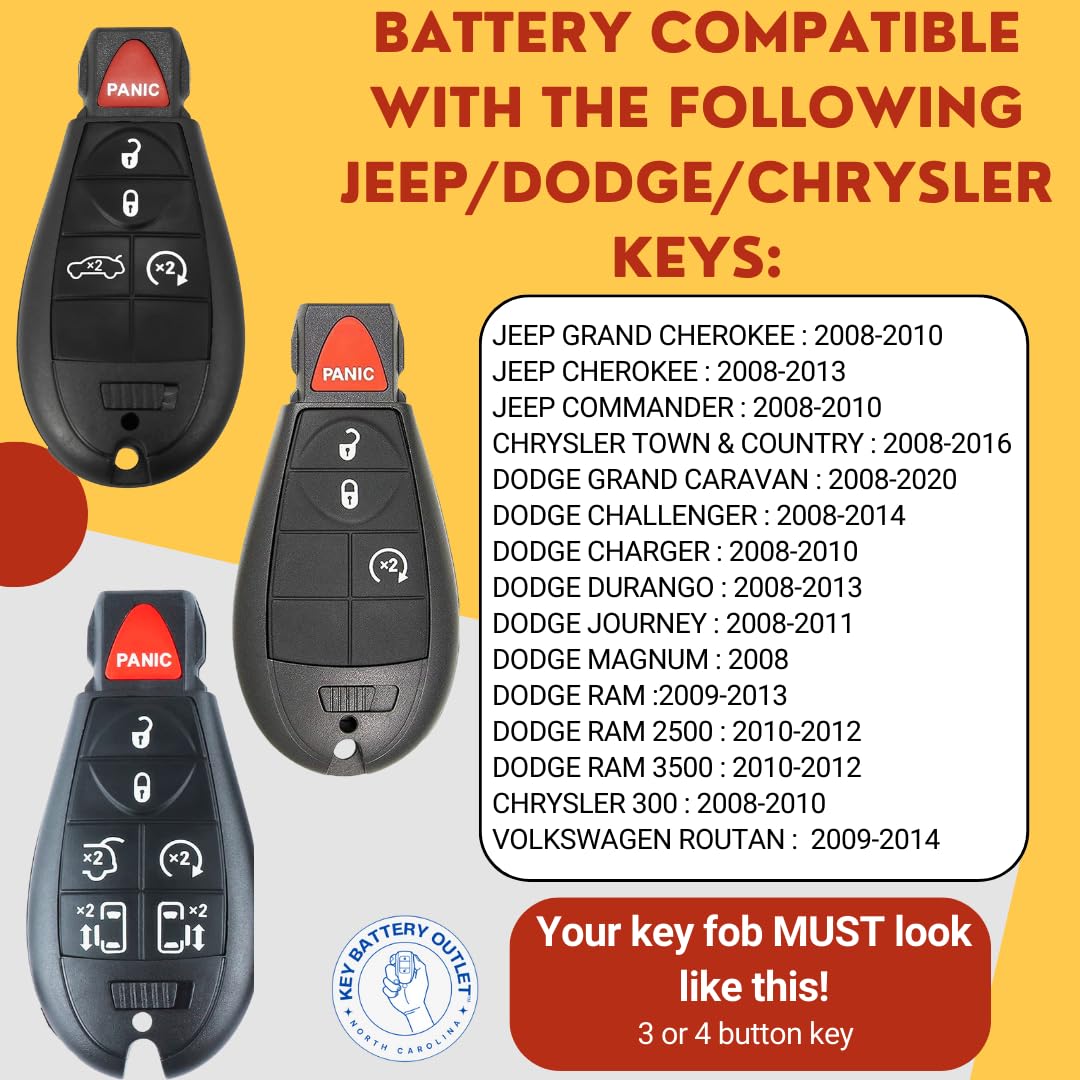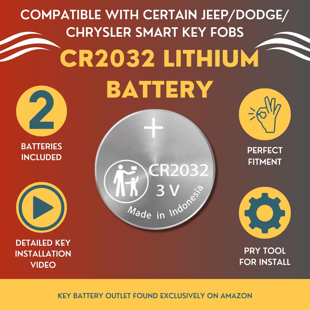 Elevate your Dodge driving experience with our 2-pack OEM CR2032 Battery Replacement Kit for Chrysler Vehicles. Effortlessly replace your key fob battery with the included pry tool for Jeep Vehicles. Our fitment guide ensures compatibility, and an install video makes the process a breeze. Enjoy uninterrupted driving with genuine OEM quality batteries. Upgrade your Dodge key fob now!